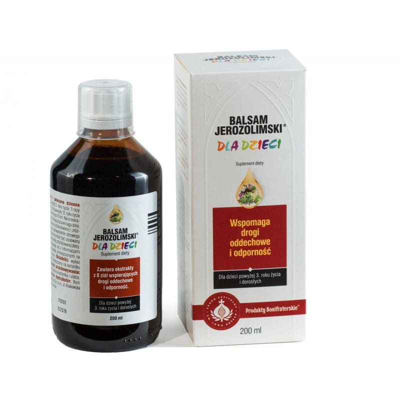 BALSAM JEROZOLIMSKI® DLA DZIECI zawiera starannie dobraną kompozycję ziół stworzoną według zakonnej receptury Zakonu Bonifratrów, w trosce o prawidłowe funkcjonowanie układu oddechowego i odpornościowego. Składniki zawarte w preparacie wspierają właściwe funkcjonowanie układu oddechowego i odpornościowego, łagodzą podrażnione gardło, krtań oraz struny głosowe, ułatwiając odksztuszanie.