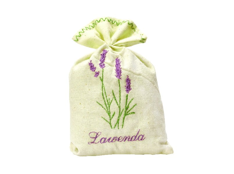 Woreczek wykonany jest z płótna lnianego, wyszytego ręcznie oraz wypełniony kwiatem lawendy.