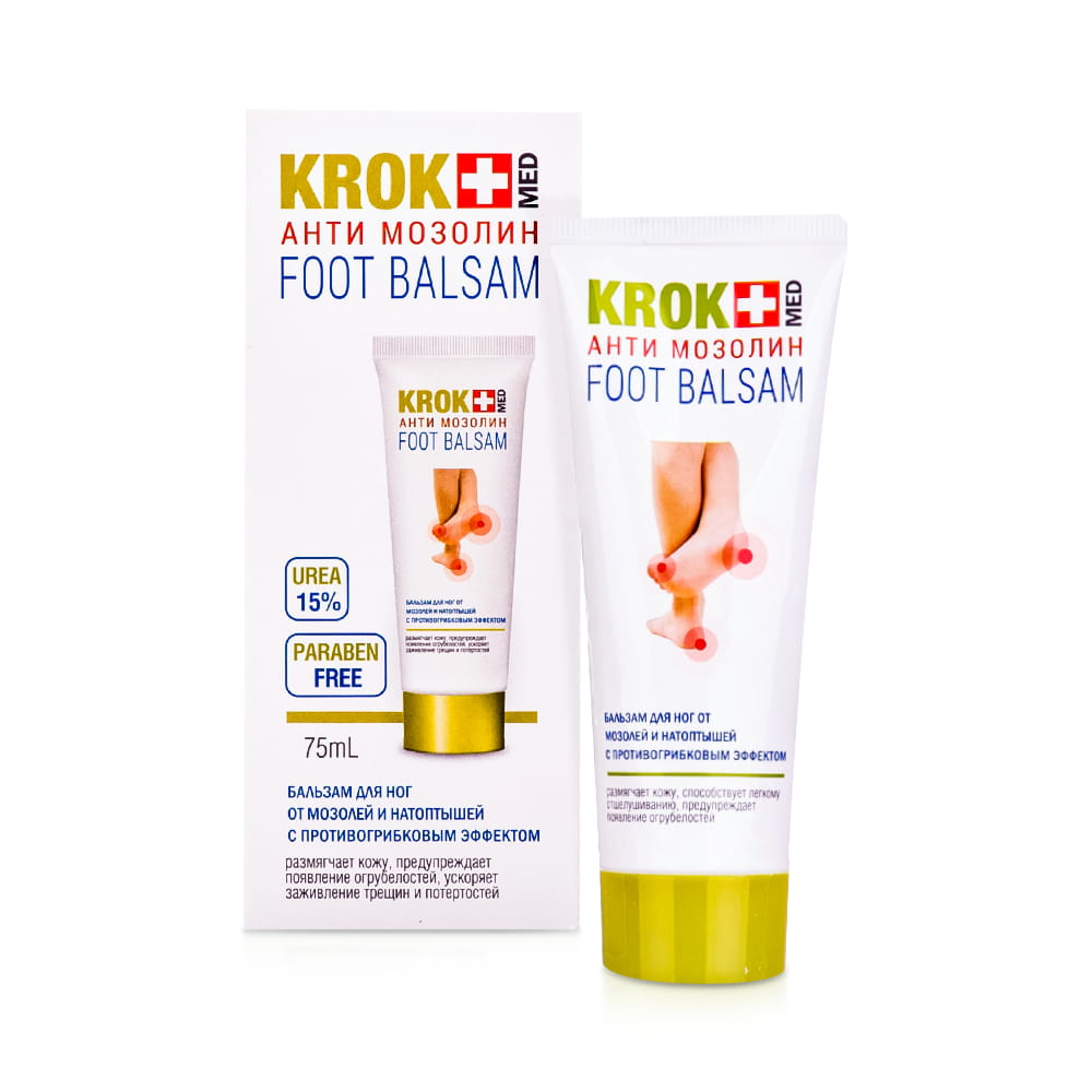 KrokMed Antimozolin to balsam do miejscowej pielęgnacji skóry stóp ze skłonnością do zrogowaceń, modzeli i odcisków. Formuła zawiera 15% mocznika oraz składniki wspierające złuszczanie i zmiękczanie warstwy rogowej naskórka.