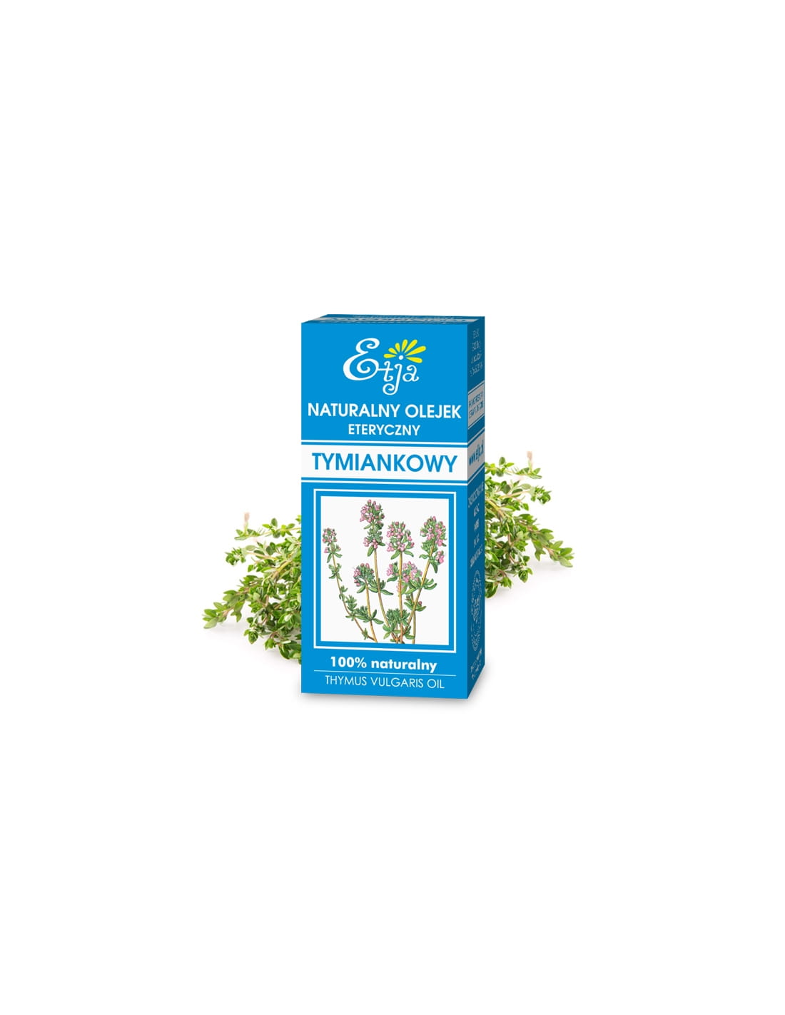 Naturalny olejek otrzymuje się z ziela tymianku pospolitego. Olejek ma bardzo silne własności antyseptyczne. Stosuje się go również ze względu na jego działanie wykrztuśne. Pobudza ruchy rzęsek wyścielających drogi oddechowe i nasila wydzielanie śluzu. Stosuje się go głównie w przypadku kaszlu i w nieżycie dróg oddechowych. Działa także przeciwbólowo przy reumatyzmie i artretyzmie. Stymuluje krążenie i podnosi ciśnienie krwi. Na skórę działa odkażająco, niszczy bakterie i grzyby pasożytnicze. Zwiększa odporność organizmu na infekcje wszelkiego rodzaju.